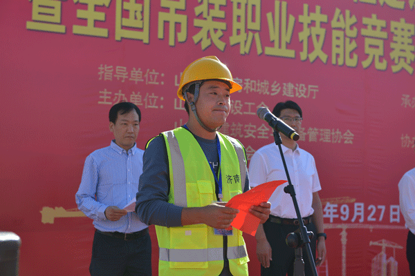 参赛选手来自济南四建集团的刘顺卿代表参赛选手宣誓。